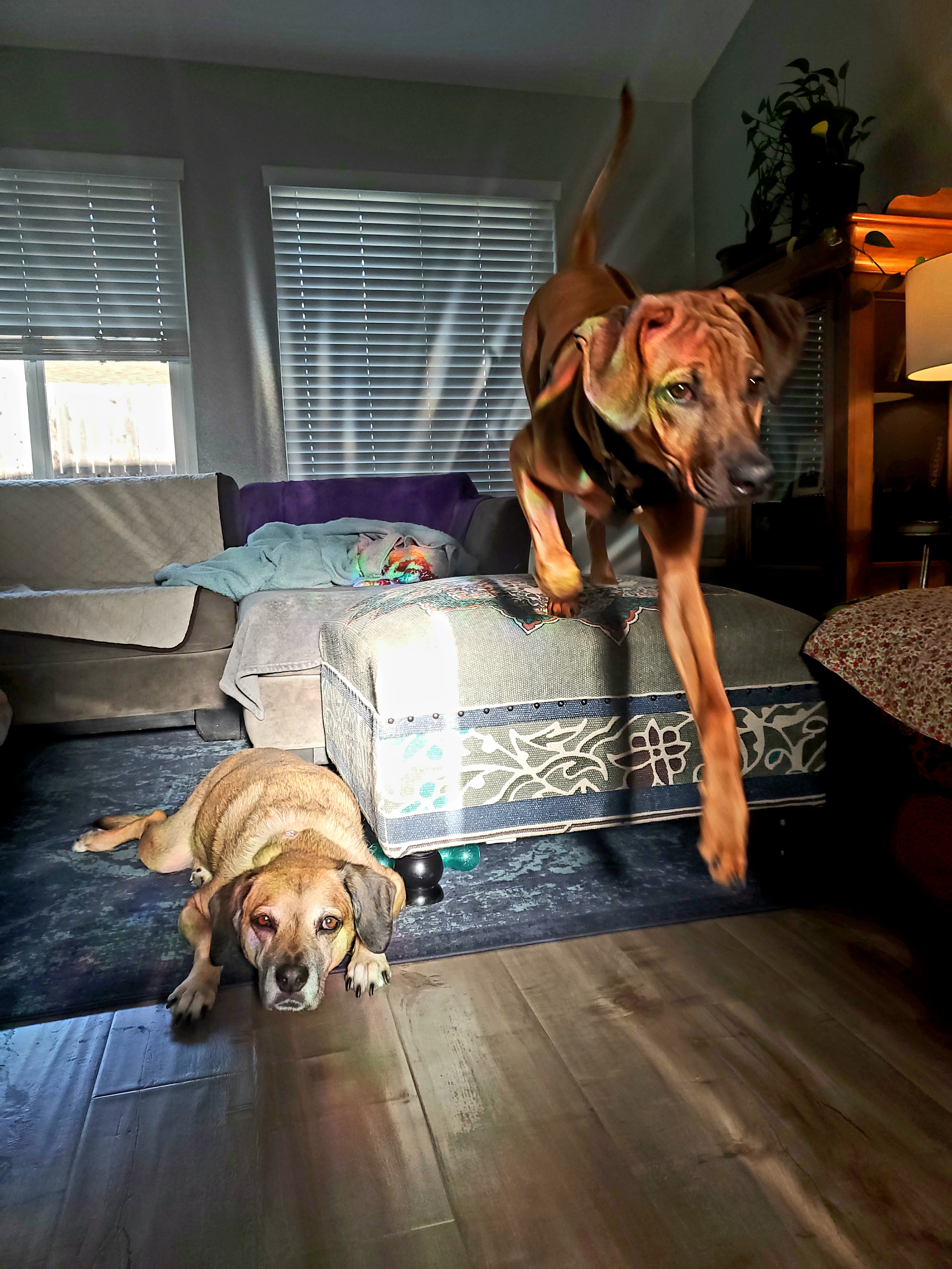 Our dog Jessie laying down while Duke our ridgeback jumps off the ottoman.