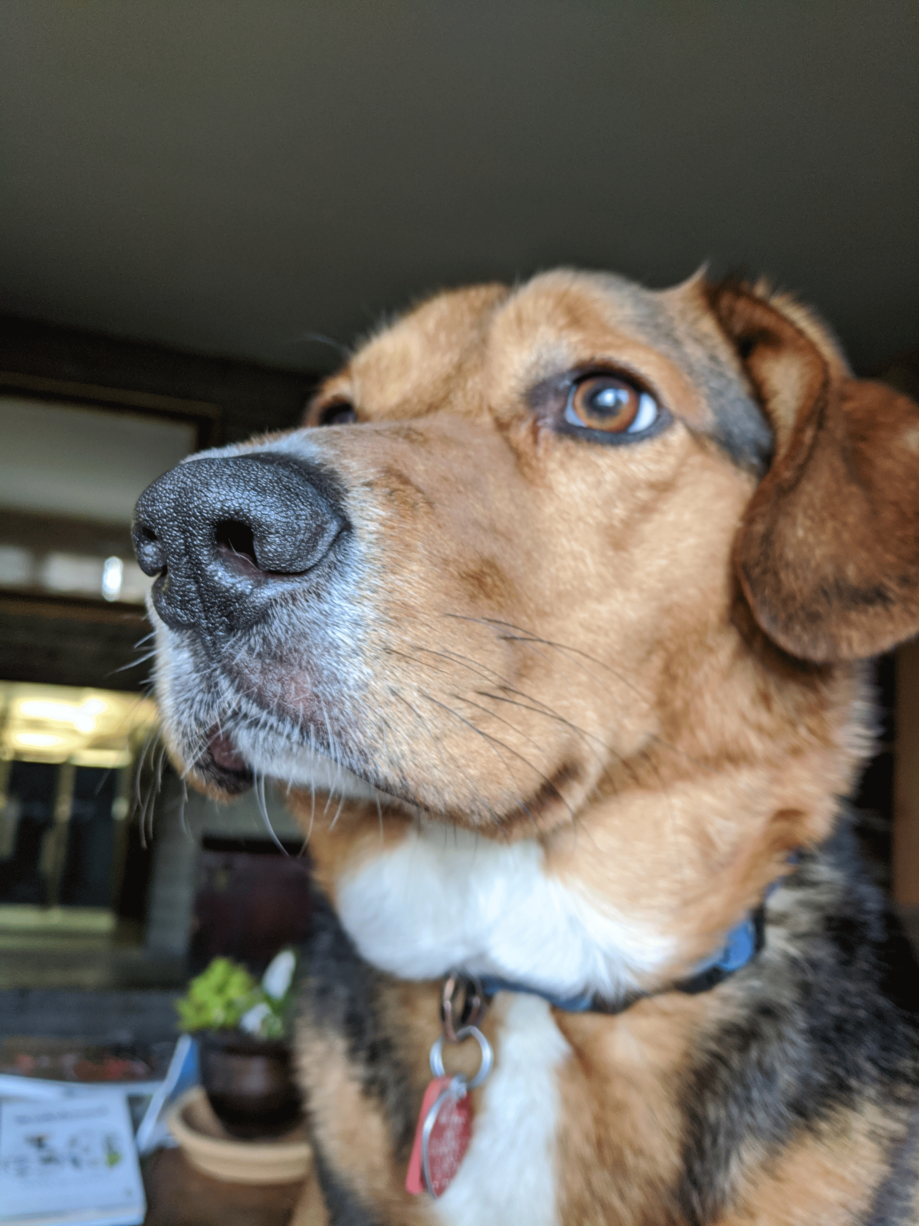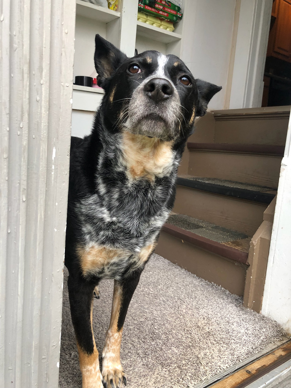 Our dog Benny peaking out from our back door.