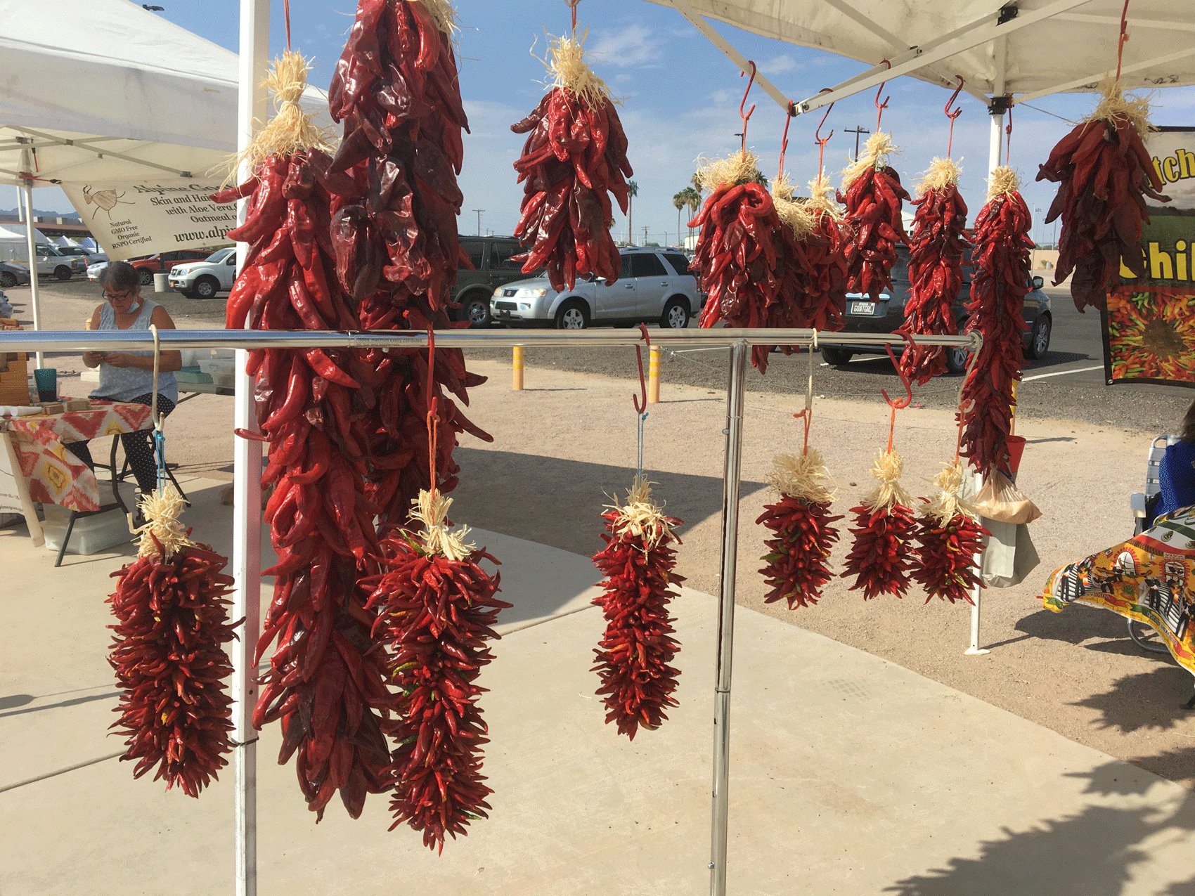 Rillito farmer's market on Sundays in Tucson is a good place to get a bite to eat, buy fresh veggies, and yes, hot chili decorations!