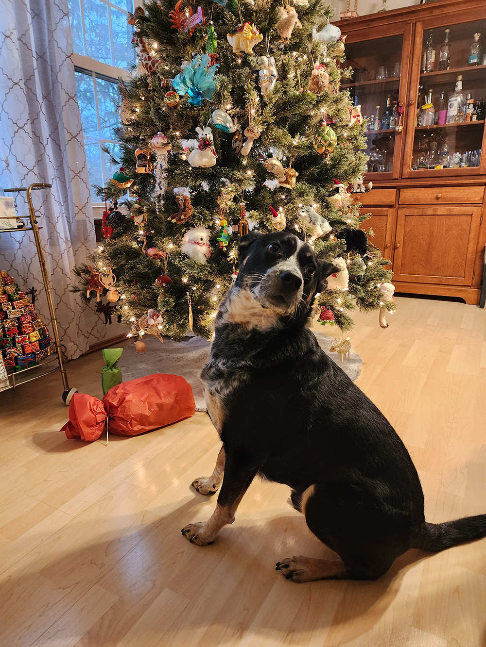 Our dog Benny "the jet" Rodriguez in front of our Christmas tree.